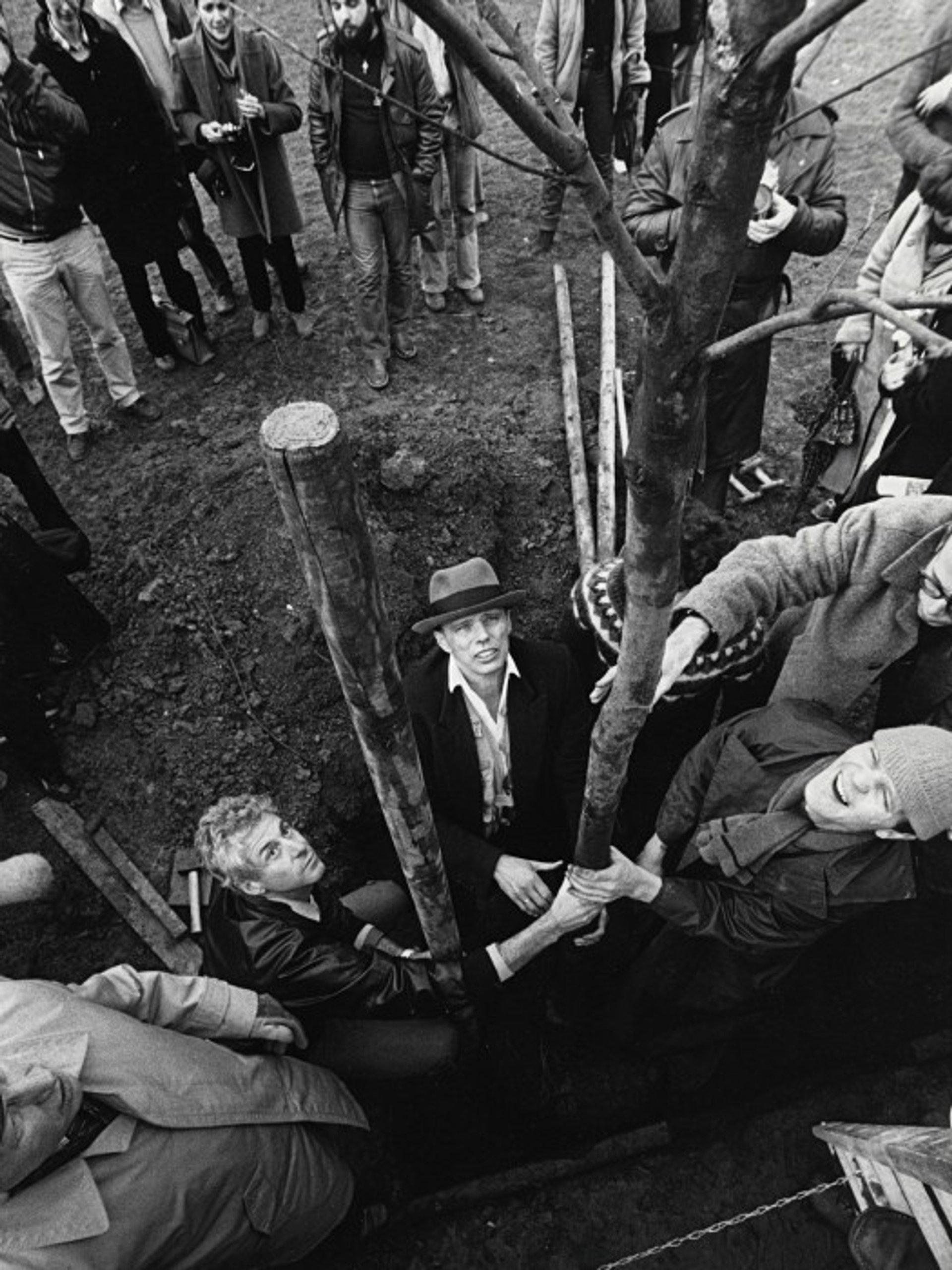 Scorn for the art establishment also fuelled Beuys’s appeal. He delighted in creating works that were too big for any museum, like the 7000 Oaks project at Documenta 7 in 1982, which involved dragging a huge rock slab into a park in Kassel for every one of the 7,000 trees that he planted. Beuys also paraded around with a dead hare, and smeared himself in fat at events, relishing a grostesquery that he shared with Gunter Grass, another young army veteran (and Hitler Youth member) who became a cultural leader in post-war Germany. Like Grass, Beuys took his rebellious brand into politics, but charisma only went so far. The documentary shows some of his odd theories being repudiated by the Green Party, in which he was active.