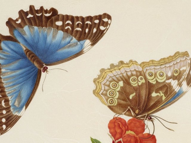 Although she painted on paper, her watercolours on translucent parchment are her trademark and make her flowers and insects glow. She also developed a new way of depicting her subjects, freeze-framing them in different phases of their development. Since her theme was symbiosis, she depicted the plant on which her insects fed and lived (the insects were always life-sized, the plants sometimes reduced to fit the page). This microcosmic world (Carin Grabowski calls it an “Ecosystem”) is strikingly animated—like a history painting in miniature. But Merian was not above making aesthetic changes, even switching ugly plants for more attractive ones to please her readership. Her daughters, Johanna Helena and Dorothea Maria, were quick learners—indeed it is frustratingly difficult to distinguish between the work of mother and daughters, a task Grabowski undertakes consistently for the first time.
