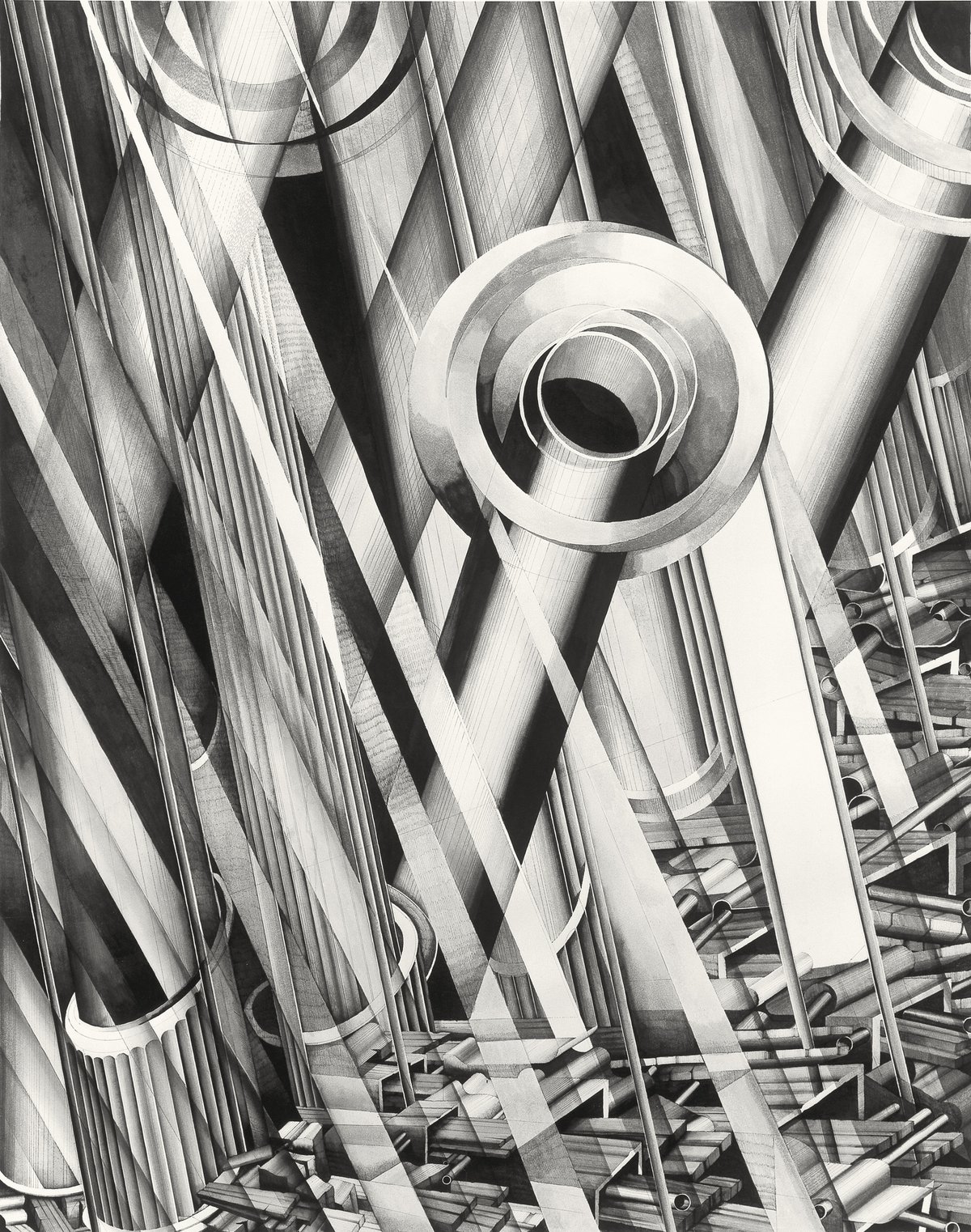 The outcome of her dedication to drawing is illustrated with admirable fidelity throughout this book, which also contains fold-out plates to convey the full scope of her largest works. She is stimulated by the perpetual challenge of pushing her abilities as far as they can go towards monumental images. In his essay on Petherbridge, Roger Malbert emphasises that in 1991 she undertook one of the largest mural commissions anywhere in the UK. It was installed on the curved “drum wall” of the concert hall at Birmingham’s International Convention Centre. He describes how, extending “over four floors in a ziggurat formation narrowing towards the top, the drawing represents a ‘fictive architecture’ with a subtle tonal and colour scheme intended to orientate concertgoers in the surrounding foyers”.