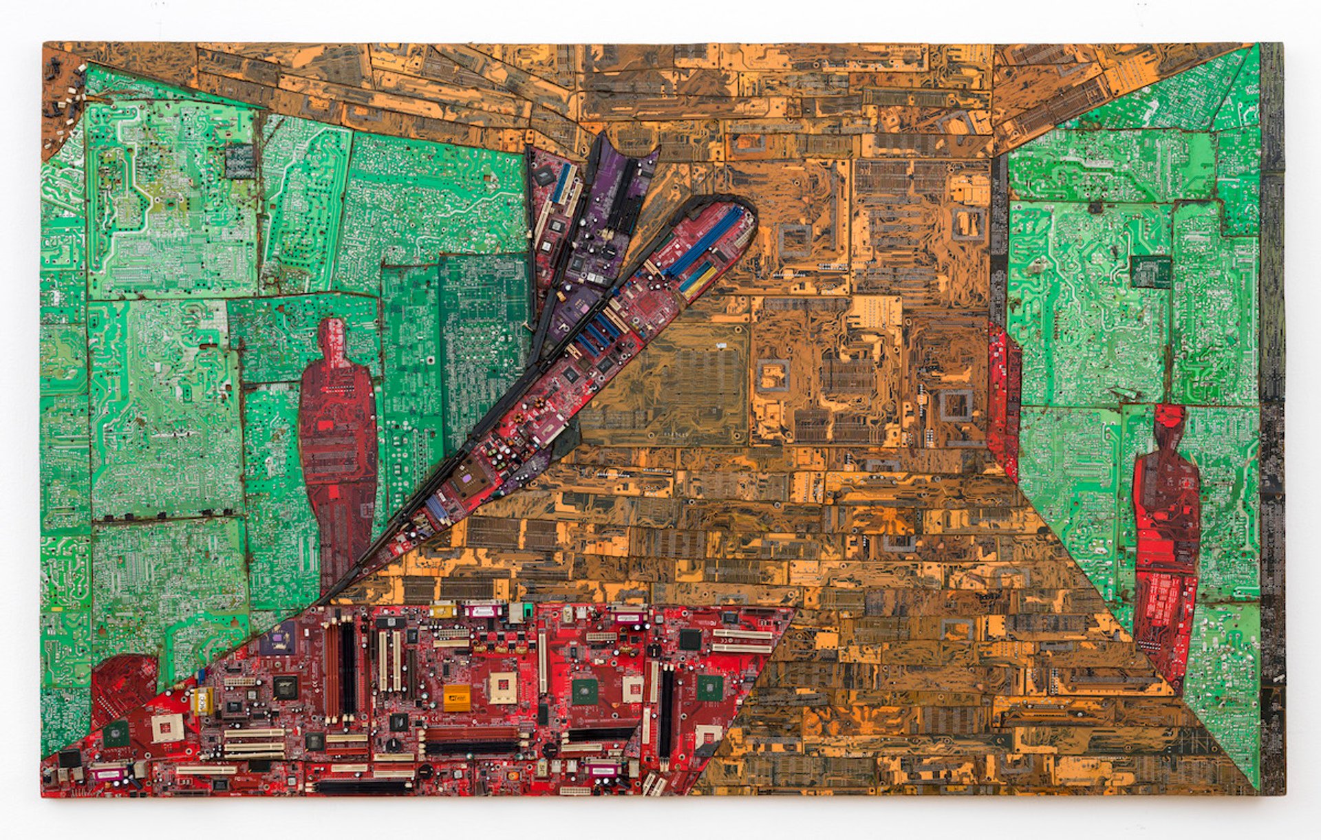 Sime has worked with repurposed materials for most of his career in reference to West African weaving and braiding traditions. For the artist, completing a single piece is sometimes a years-long process that involves scouring markets and dealing with private sellers to source the precise material to be amalgamated into his large-scale compositions, whether that’s a dated motherboard or a uniquely coloured electrical wire.