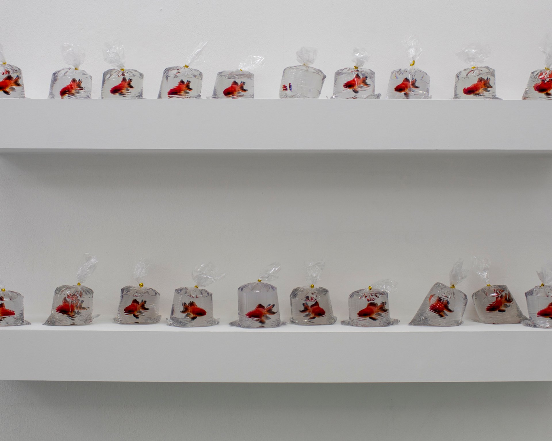 Fraser’s work takes us back to sources of his childhood wonder and fascination, a number of which he has cast in resin. Several of these call back to English fun fairs: a series of holographic goldfish in resin resembling plastic bags filled with water; candy-coloured primed fireworks arranged like a fossilised rock collection. Further holographic works include a self-portrait in resin, formed of 10 layers that produce the effect of his face floating underwater.