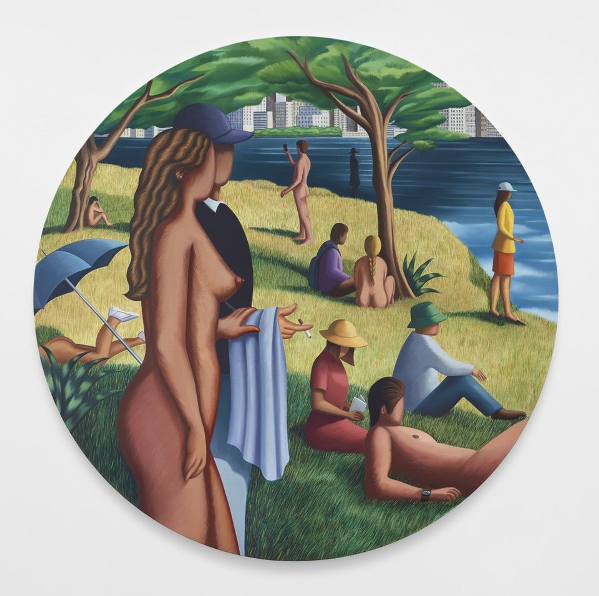 Julie Curtiss's star has risen fast over the past two years. Following a spate of astounding auction results that transformed her from emerging artist to market darling at breakneck speed, she signed to White Cube in February 2020. Unsurprisingly, her highly anticipated first UK solo show doesn't veer far from the style that has brought her mega success. Bringing together a group of new oil paintings, monochrome gouaches and small sculptures, it delivers an uneasy balance of the grotesque, absurd and captivating. Le Futur (2021), painted on a circular canvas, is Curtiss's Surrealist take on Seurat's masterpiece A Sunday Afternoon on the Island of La Grande Jatte (1886), in which flesh is disquietingly painted to resemble the texture of sleek fur. In Coldroom 1 and 2 (2020), the bloody carcasses of cows are too replaced with flowing, shiny waves resembling chestnut locks. The resultant tone is both sterile and obscene, repulsive yet transfixing.