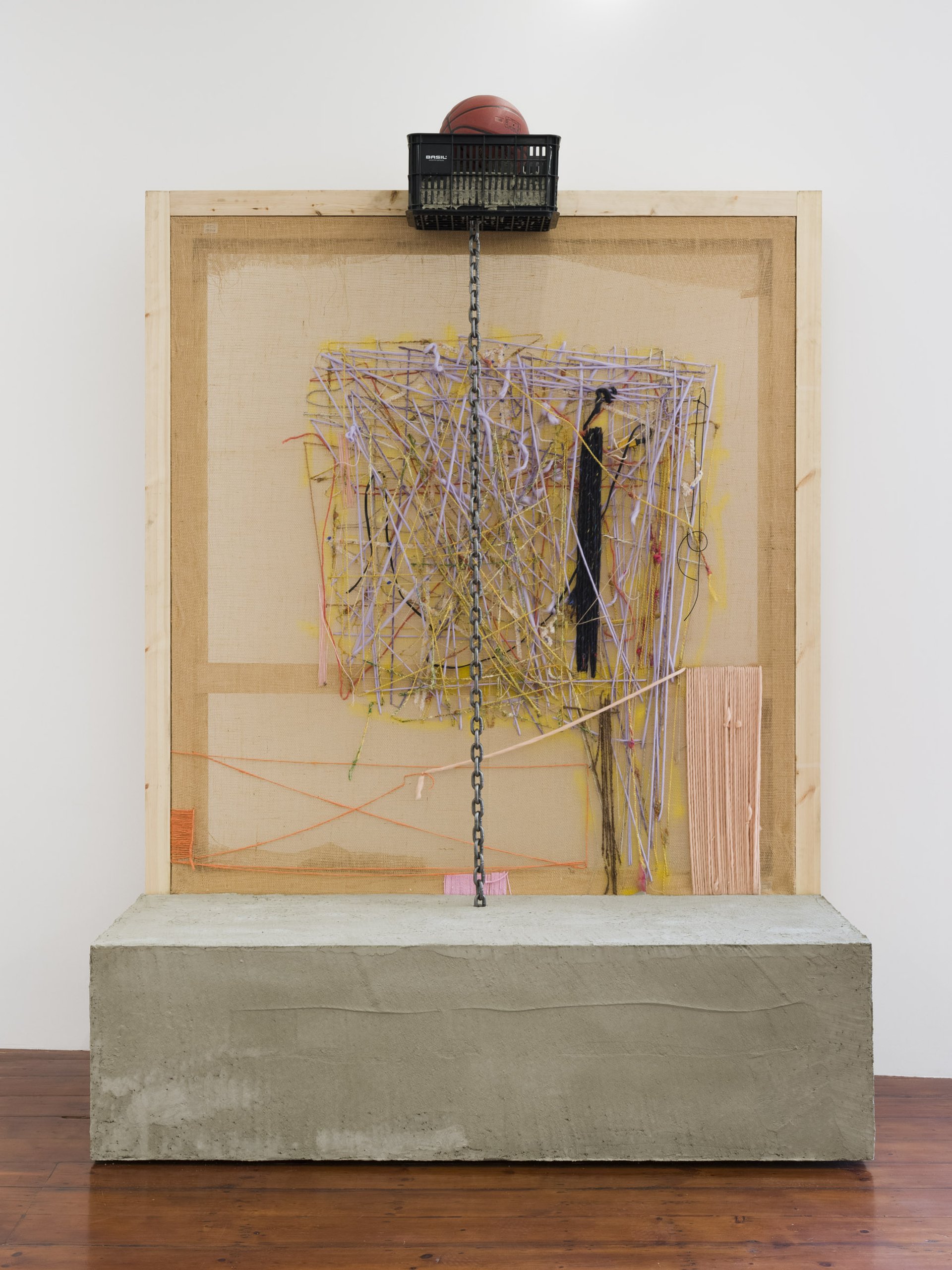 The past 18 months have been a busy time for Alvaro Barrington, who has not one but two solo shows at Emalin. In the gallery's main space are painting and concrete-based works, including Street dreams are made of basketball (2021). On the frame of a canvas criss-crossed with coloured thread Barrington has placed a basketball inside a plastic crate. A taut metal chain extends like a spine from the crate to a hulking slab of concrete at the work's base, linking together the urban and the domestic spheres. An accompanying series of small, figurative acrylic-on-textile paintings based on Tiktoks bear hurried daubs of bright colours to evoke the immediate and ephemeral nature of a one minute-long video. In one, a Black figure raises their hand: it is unclear whether this is part of a choreographed viral dance move or a symbol of political resistance.
