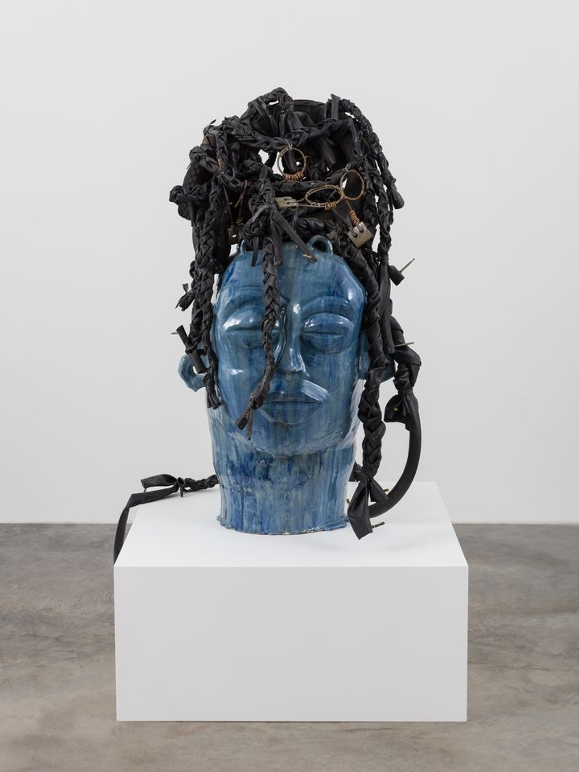 The artist Leilah Babirye was forced to flee her native Uganda after being outed as a lesbian by the local press in 2015. Her first European solo show brings together a range of ceramic, wood and found object sculptures of semi-abstracted masks, busts and figures that bear weathered surfaces and draw from a range of African and European artistic traditions. The largest of these to date, a totemic 13-ft-tall blue ceramic work, stands in the garden of Stephen Friedman Gallery. Based around the royal families of Uganda, most of the show's sculptures are named after various queen mothers who historically held dominant positions in society. Donning gender-bending beards and ornaments typically associated with trans femme groups, the works are resolutely queer and celebrate kinship among the kuchu community, a “secret Lugandan word”, Babirye says, that LGBTQ people use to refer to one another. Much of the work is composed from debris that Babirye scavenges from the streets of New York, such as bicycle tires that she braids into hair, or discarded chains and tin cans that she welds and hammers into earrings. Beyond giving the work a rough, industrial materiality, the choice of repurposing waste has a deeper symbolic resonance. In Luganda, a common pejorative slang for gay people is ebisiyaga (trash).