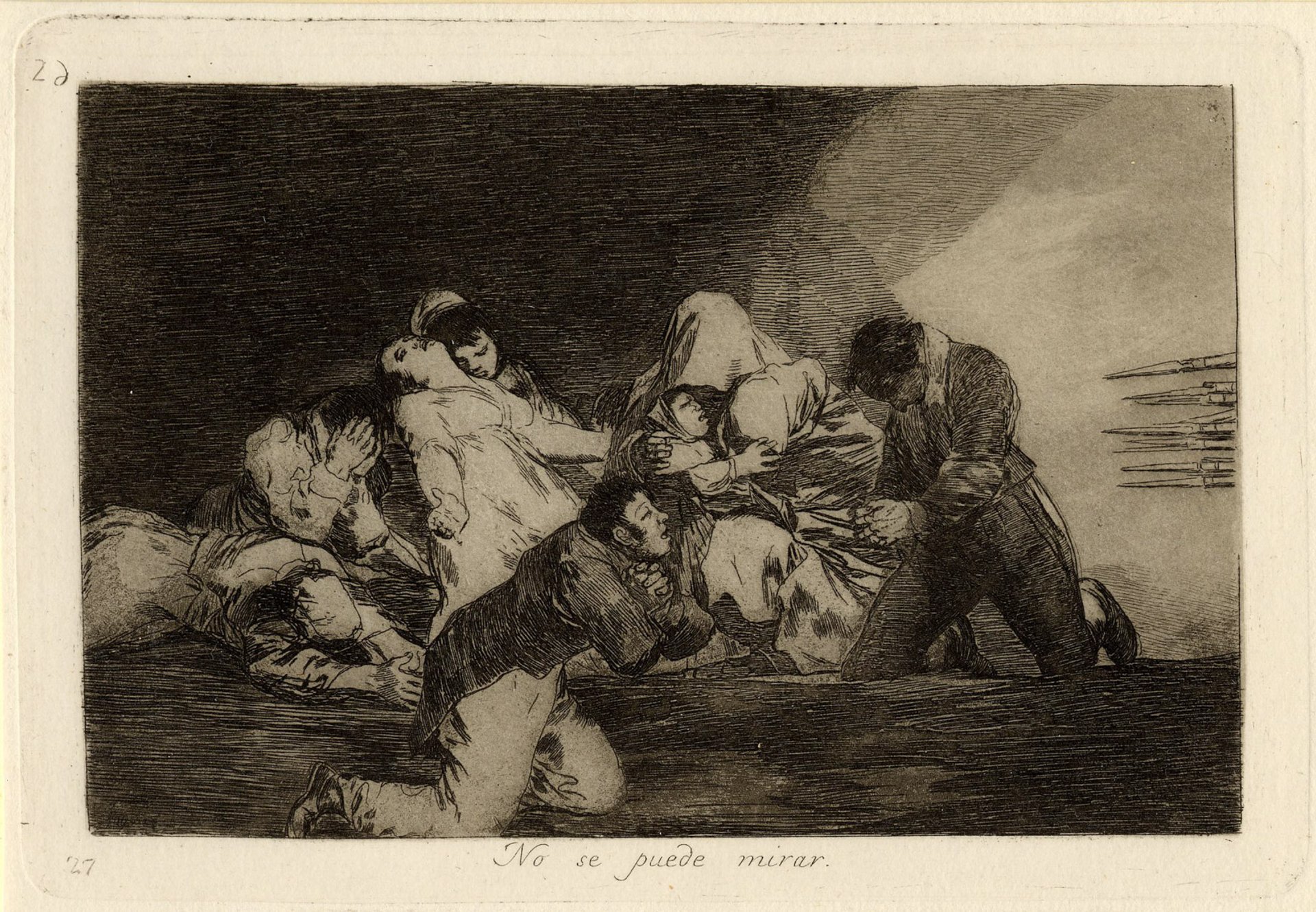 “This is one of the greatest moments in the history of Western art—and Goya repeats the strategy in another plate in The Disasters of War series. One can’t look is a choreography of emotions, of people’s suffering. Each individual is carefully represented—how he or she is reacting to the fear of the moments before they die. And then you see this impersonal, headless machine of war: the row of bayonets. It seems to be like a slice of reality: time has frozen, but also the space is cut in half. An arrow-shaped space at the right of the composition, made with a direct wash of acid, points at the figures, so we know there’s something coming from the right side, a very violent event, and the impact is going to be felt in a few seconds.”