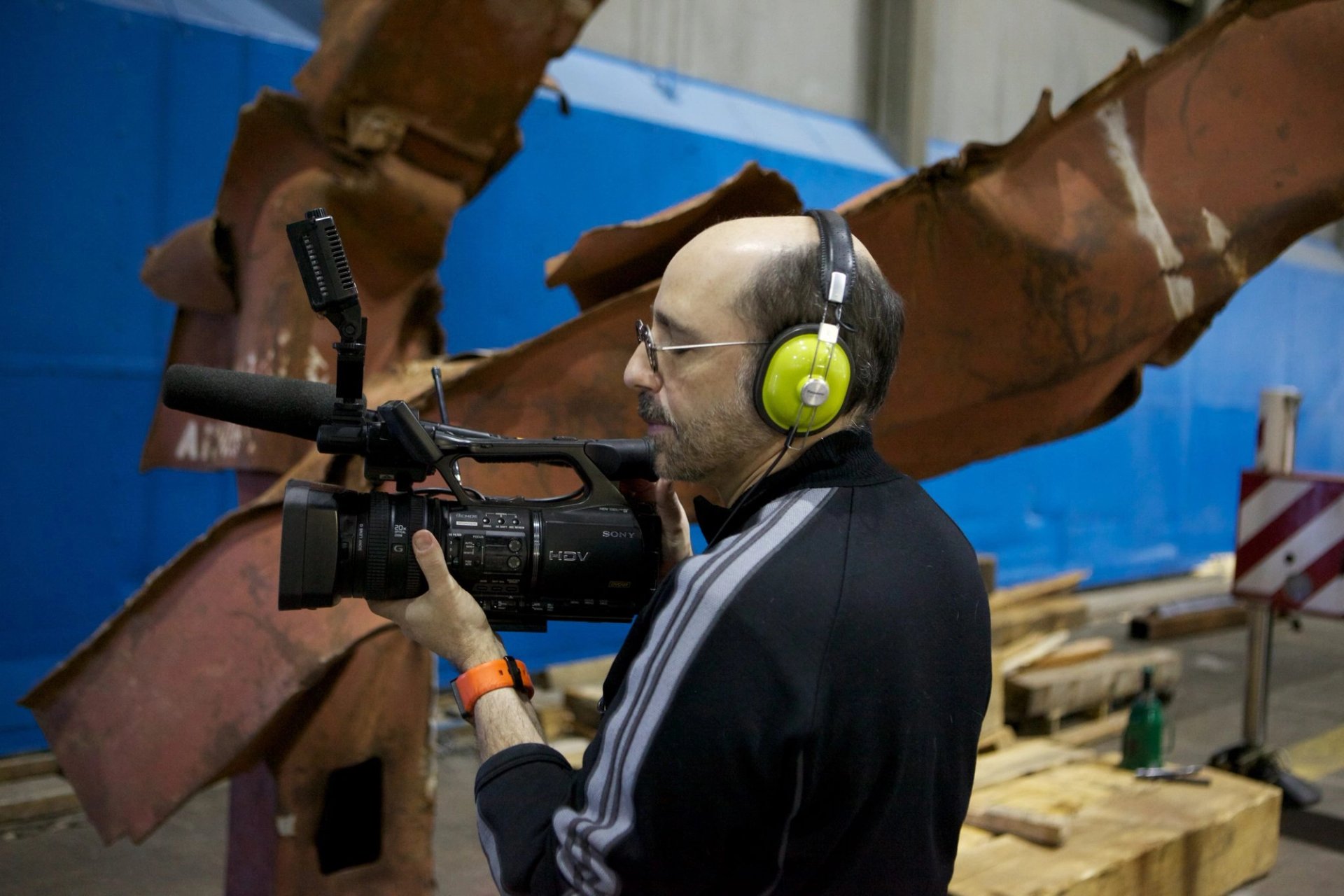 The film-maker Steve Rosenberg shooting as the museum was under construction, with one of the bent trusses from the destroyed Twin Towers behind him