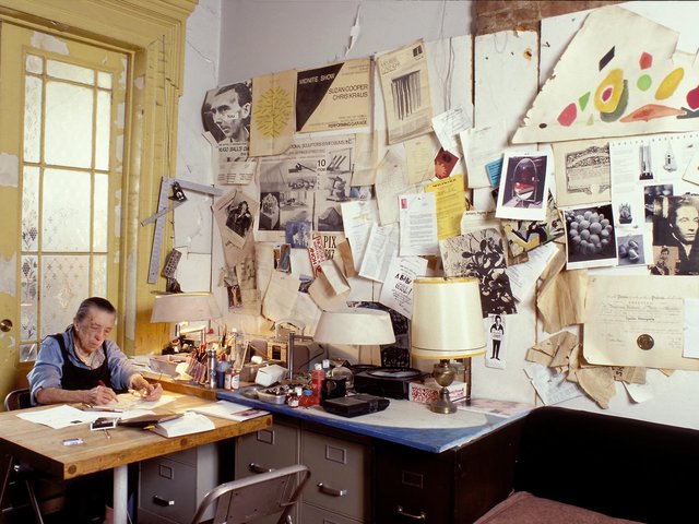 The results of those many visits are the subject of Jaussaud’s book, Louise Bourgeois: an Intimate Portrait, which was published earlier this month. We see Bourgeois from that first session, with Eyes, a knowing smile beneath the baseball cap that was her protection, or towered over by one of her Spiders. Elsewhere, she sits drawing at her desk in the cluttered office. Alongside the portraits are interiors: the cramped basement studio, the walls covered with drawings and texts—what she called her “pensées-plumes”—and the library that was her husband Robert Goldwater’s favourite room. Then there is the bedroom the couple shared until Goldwater died in 1973—Bourgeois had not spent a night there since his death. Jaussaud gained access to this room “only at the end”, he says. The room where Bourgeois slept for the last four decades of her life until she died in 2010 “was really not a bedroom, just a very simple bed, with no comforts at all”, surrounded by bookshelves.