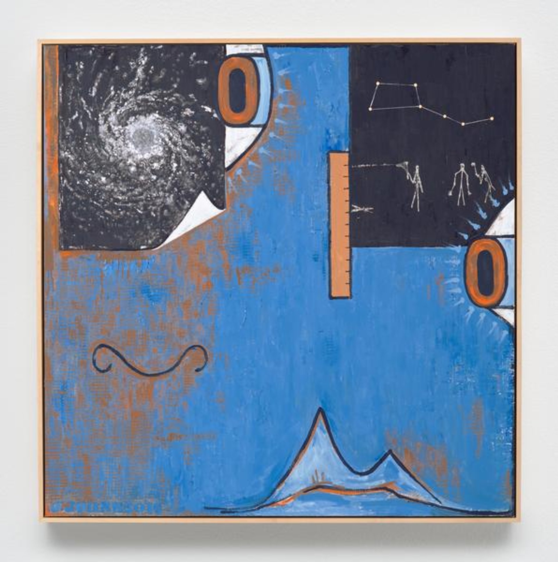 Roughly bisecting the canvas vertically, a painted ruler appears, notched, but without numerals. At the upper right corner flicker white markings on a black ground that suggests both night sky and a blackboard. They cancel all sense of scale: a connect-the-dots Big Dipper hovers above tiny petroglyph-like scrawls that might be figures wielding… brushes? Semaphore flags? The upper left corner contains another scale-busting radiant galaxy spiraling in cosmic blackness, its rectangular ground tipped up at a bottom corner like a dog-eared page to remind us of the whole work’s pictorial artifice.