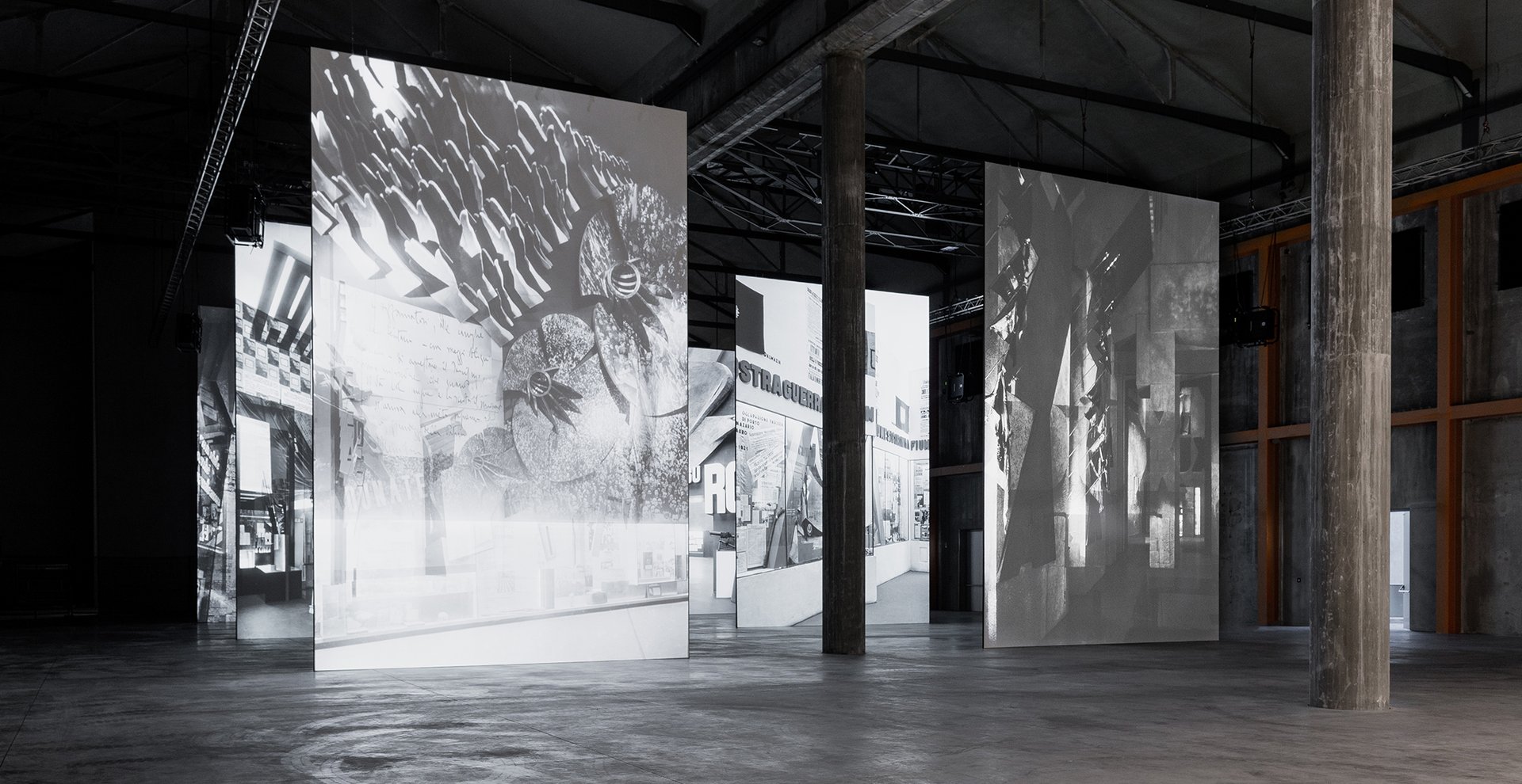 Archival photographs of the 1932 Mostra della Rivoluzione Fascista are projected on to huge screens in the Prada foundation’s massive Deposito space Delfino Sisto Legnani and Marco Cappelletti; courtesy of Fondazione Prada