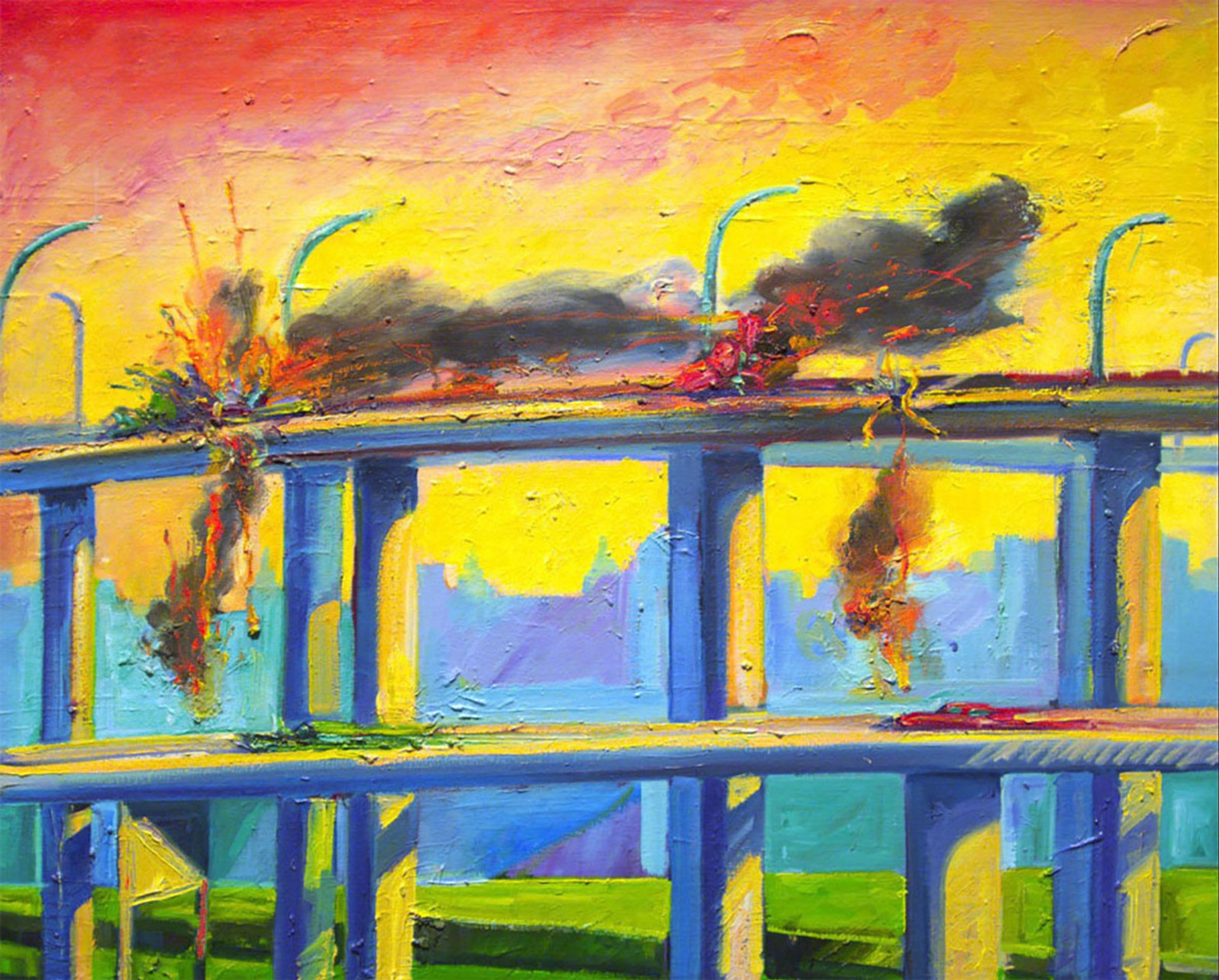 Alamaraz used certain motifs repeatedly in his work. Jaguars, people with umbrellas and bizarre demons with horns appear again and again and constitute his personal iconography, some of which Fox admits is inexplicable. But the best paintings in the show speak to the artist's straightforward fascination with death. One group of pictures shows cars exploding, crashing and plummeting off cliffs. These haunting paintings cut against his love of urban life and seem to say that behind the joys of life, some violence is always lurking.