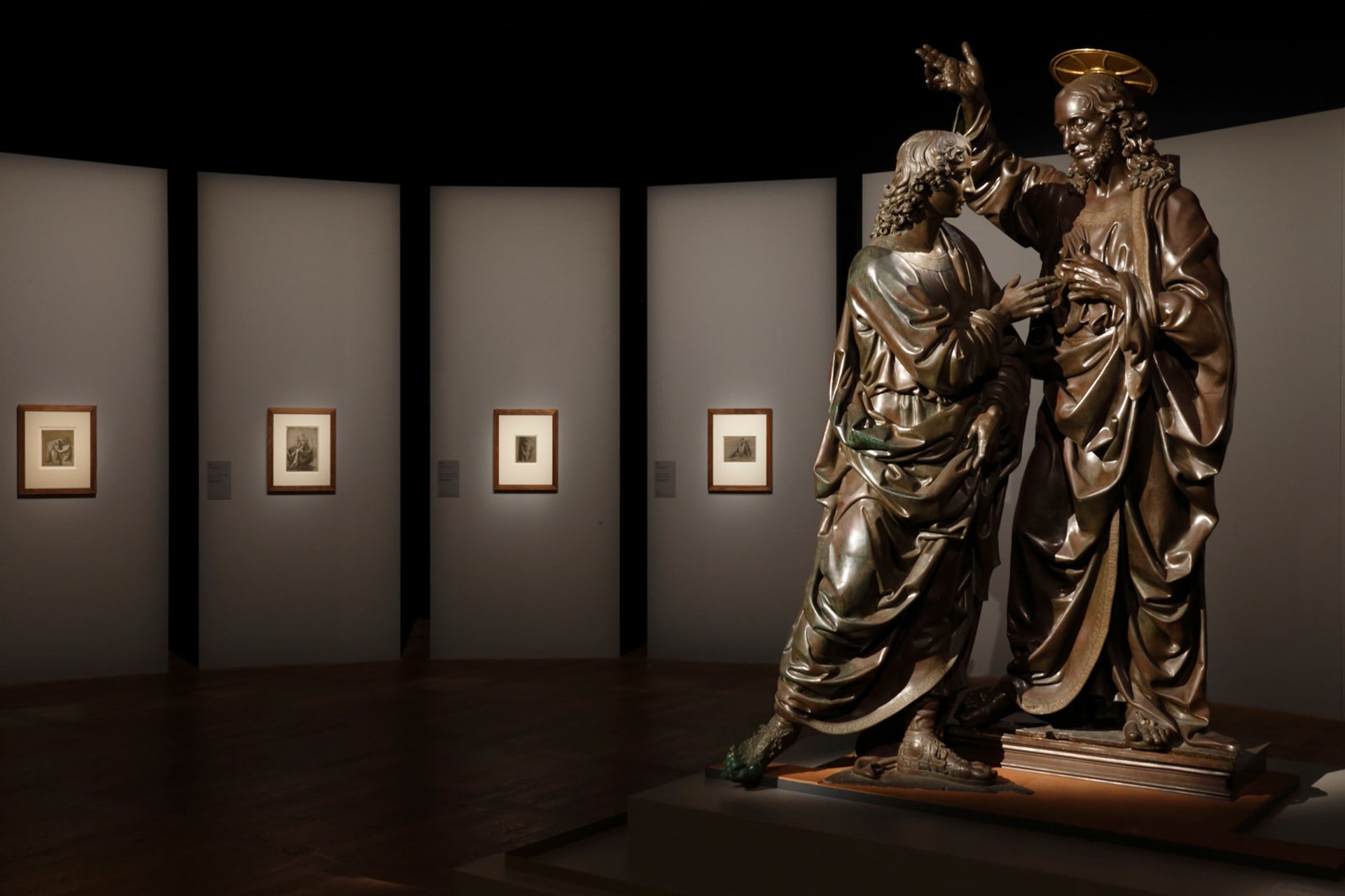 Verrocchio's sculpture of Christ and Saint Thomas greets you as you enter, surrounded by drapery studies made when Leonardo was working in Verrocchio’s studio © Musée du Louvre/Antoine Mongodin
