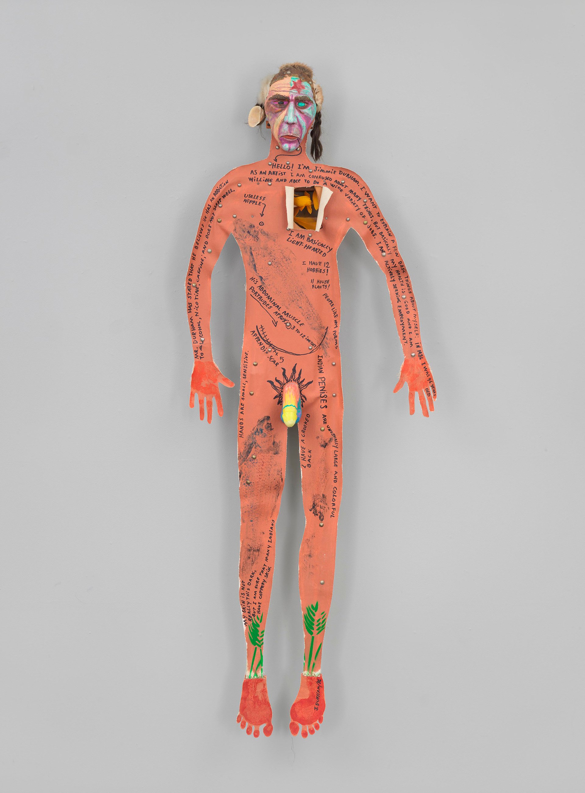 There are also many references to Durham’s personal history, and specifically his claims of Cherokee ancestry. His sculpture titled Self-portrait (1986) depicts him with red skin, a painted face and a note scrawled beside his mostly yellow penis: “Indian penises are unusually large and colourful.” Across the chest and left arm, Durham wrote his name, age and that he is “actively seeking employment”.