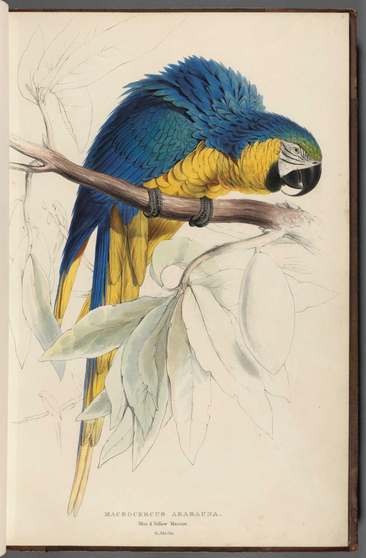 Through medical and scientific patrons Lear became acquainted with the circle of London naturalists gathering, at the start of the 1830s, around the recently founded Zoological Gardens (1825). By the age of 18 Lear had mastered the new technique of lithography and already embarked on his book Illustrations of the Family of Psittacidae, or Parrots (1830-32), now recognised as one of the supreme masterpieces of ornithological art.