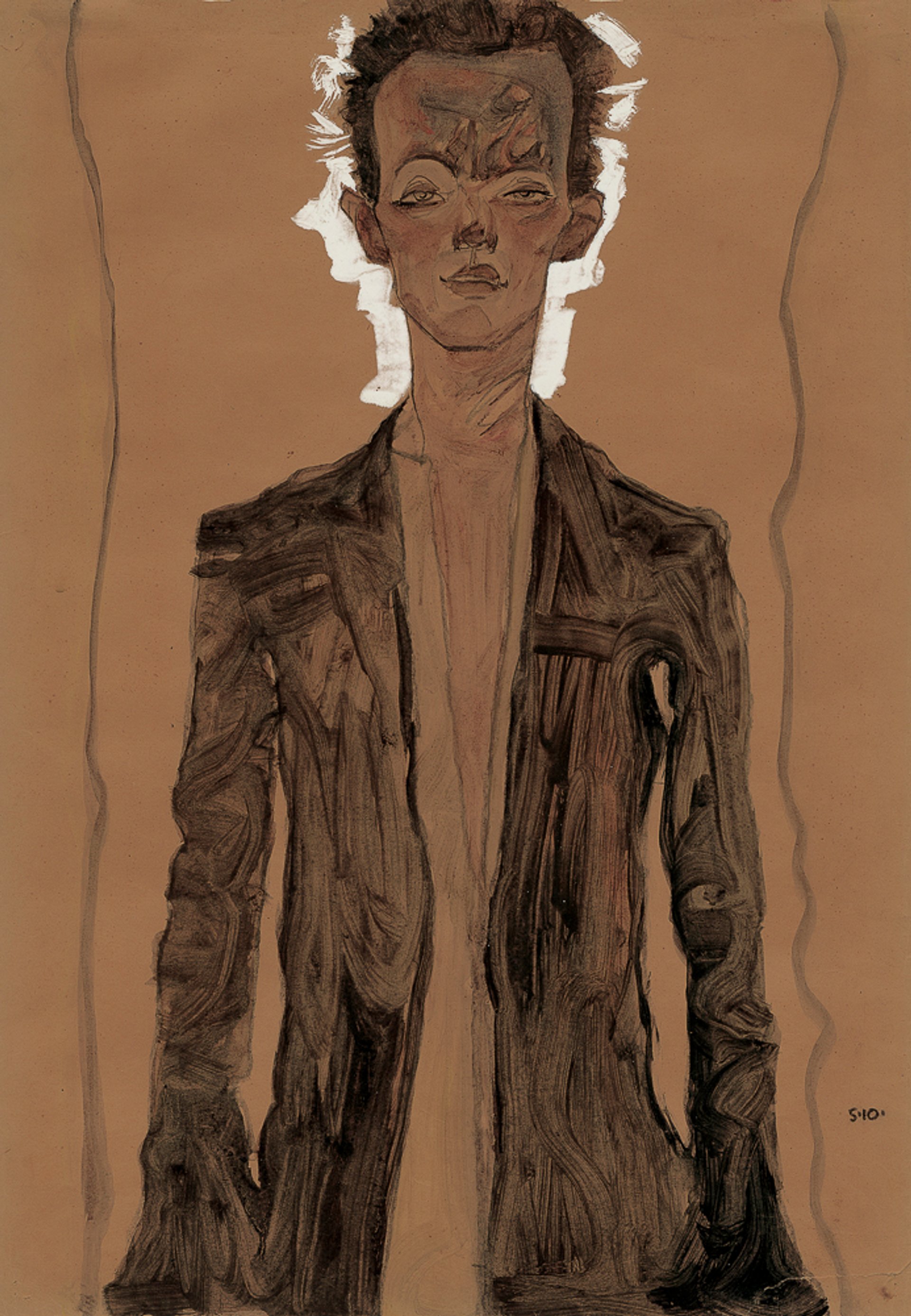 Egon Schiele, Self-portrait in a brown coat (1910)