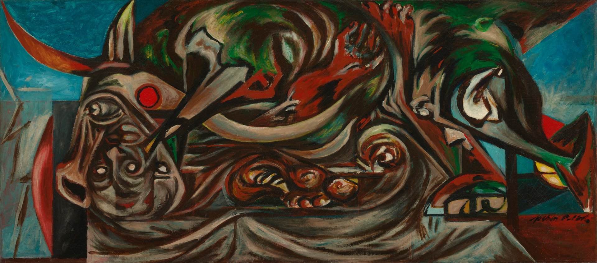 The exhibition finishes with a section devoted to the artists who prefigure Abstract Expressionism, with an early, semi-figurative work by a 26-year-old Pollock taking a central position. The degree of debt at this point to European Modernism is unavoidable. Pollock’s Untitled (1938-41), a mix of swirls and angles with the half-glimpsed heads of men and beasts, shows the impact of his encounter—which Barter calls "life changing"—with Picasso’s Guernica (1937), which travelled to New York in 1939. Such influence ran deep in America. Arthur Dove's abstract pictures of American jazz owe much to Wassily Kandinsky, while Ilya Bolotowsky’s Study for the Hall of Medical Sciences Mural at the 1938 World’s Fair in New York bears more than a passing resemblance to the work of Juan Miró.
