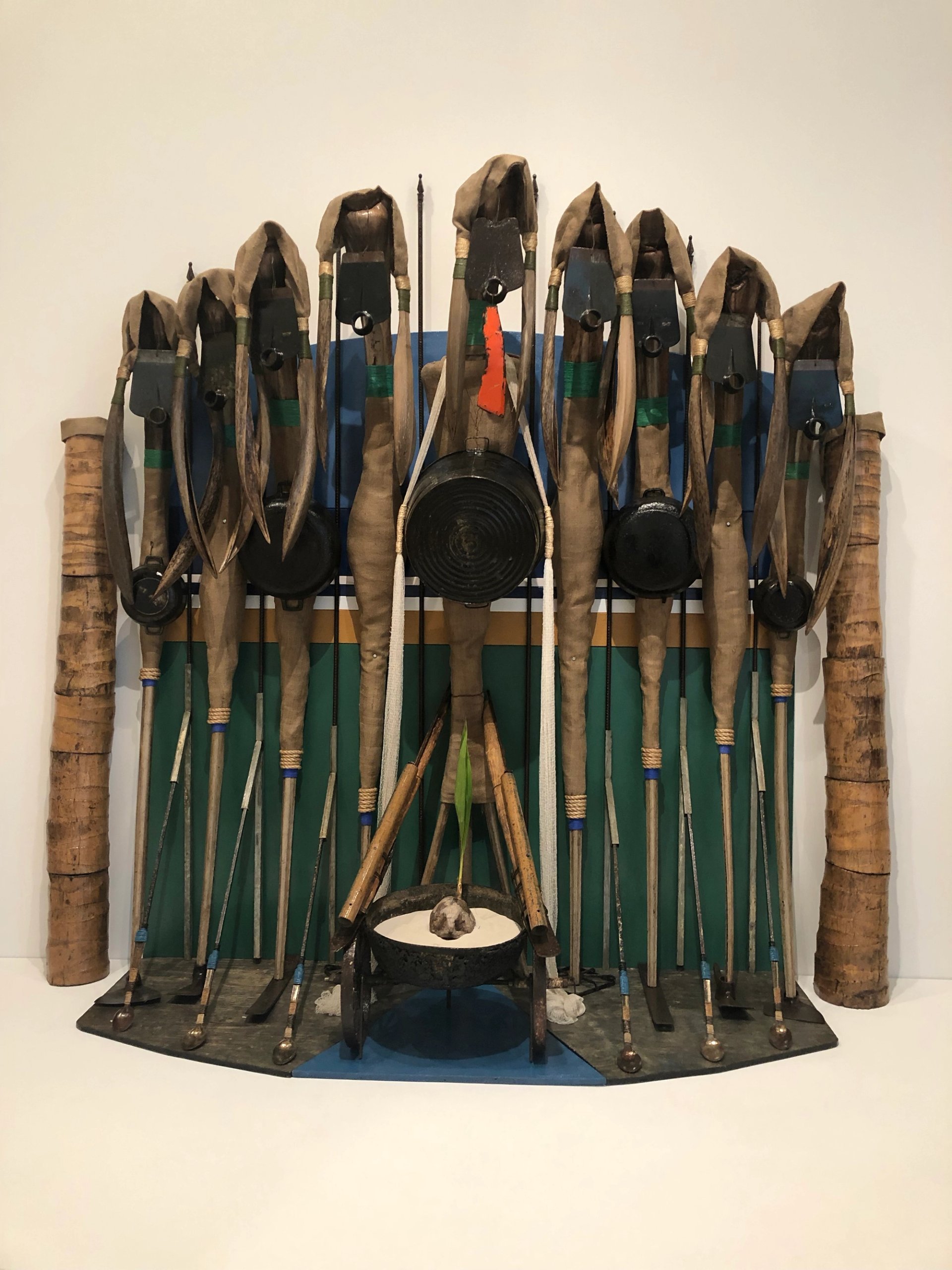 If there is a breakout star here it may be Daniel Lind-Ramos, who is in his mid-60s and whose cultural-specific sculpture is better known to citizens of his native Puerto Rico than to those in the US. Centinelas (Sentinel), the more transcendent of two works he has in the show, is an assemblage of found objects that suggests a pipe organ or an altarpiece made of palm branches, burlap, tarps, spoons, a cauldron and rope. They are among the items that washed up near the artist’s home in 2017, after the disastrous Hurricane Maria wrecked the island and killed 3,000 people.